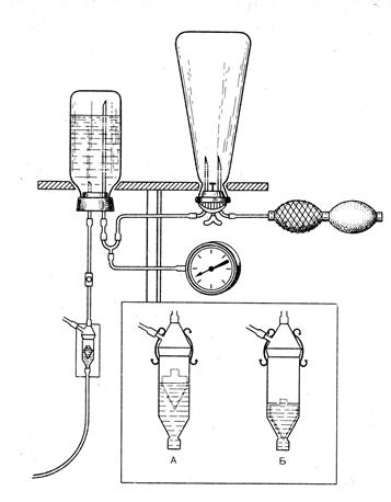 Есть интересные отечественные разработки систем для внутриартериального введения жидкостей. В.П. Сухоруков с соавторами (удостоверение на рационализаторское предложение №1 от 28 июня 1972 года, выданное Кировским научно-исследовательским институтом переливания крови) предложил систему, где помимо обычных частей имелся воздушный компенсатор и капельница с поплавком (рисунок 13).