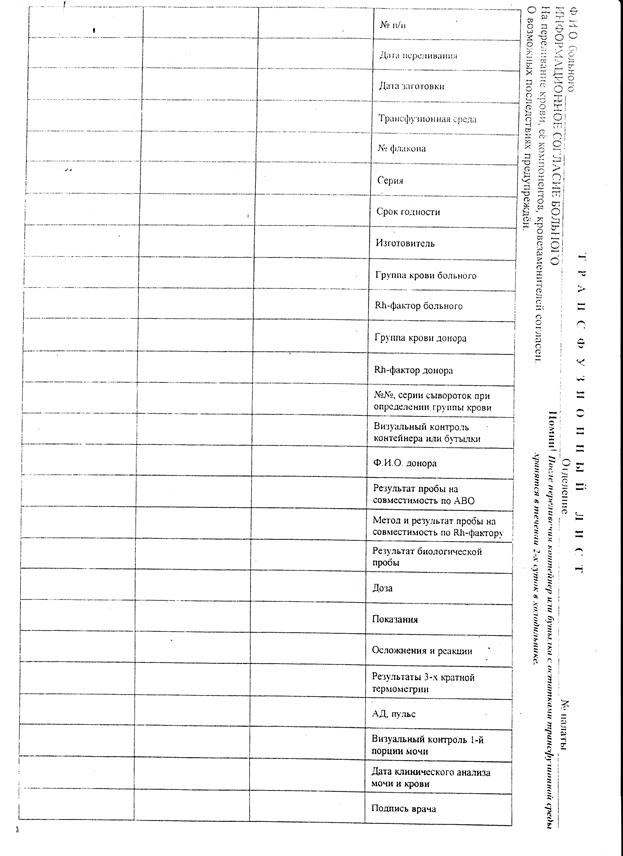 2. до начала трансфузии – паспортные данные с этикетки донорского контейнера, содержащие сведения о коде донора, группе крови по системам АВ0 и резус, номере контейнера, дате заготовки, название учреждения службы крови, (после окончания трансфузии этикетка открепляется от контейнера с компонентом крови и вклеивается в медицинскую карту больного);