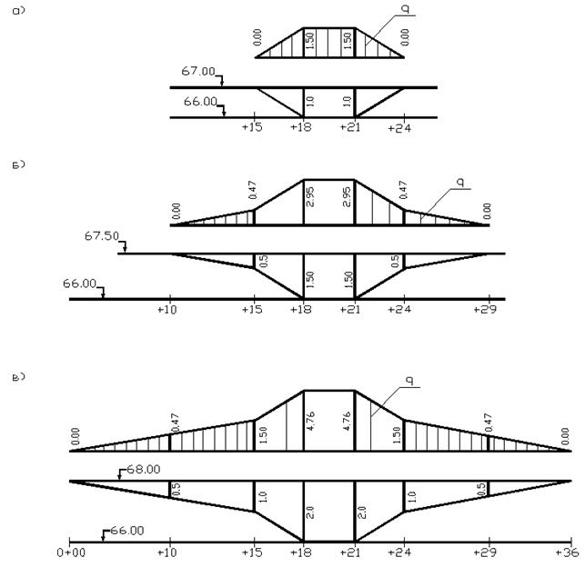 Задаем уровень воды 67,00, вычисляем глубины (рис.1.3.1а) на вертикалях, соответствующих точкам 0+18, 0+21, и вычисляем скорости движения воды по формуле (1.3.1), элементарные расходы по формуле (1.3.2). Эти данные заносим в таблицу 1.3.2 и строим эпюру элементарных расходов (рис.1.3.1а). Эта эпюра состоит из двух треугольников и прямоугольника. Вычисляем их площадь и заносим в таблицу 1.3.2 (графа 7). Суммарная площадь эпюры равна расходу при уровне 67,00.