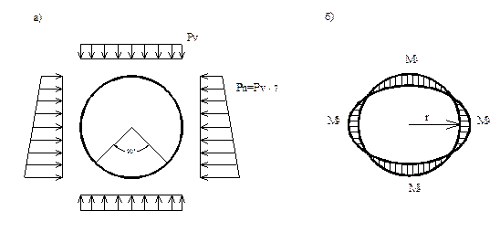В типовом проекте [4] изгибающие моменты М1 (рис.2.3) в стенках звеньев трубы определены при их укладке на песчаное основание с углом обхвата 900 при нормальной (для круглых труб 500, 600 и 800 мм) и повышенной (для труб 1000, 1200, 1400, 1600 и 2000 мм) степени уплотнения пазух вокруг трубы (коэффициент уплотнения Ку=0,95).