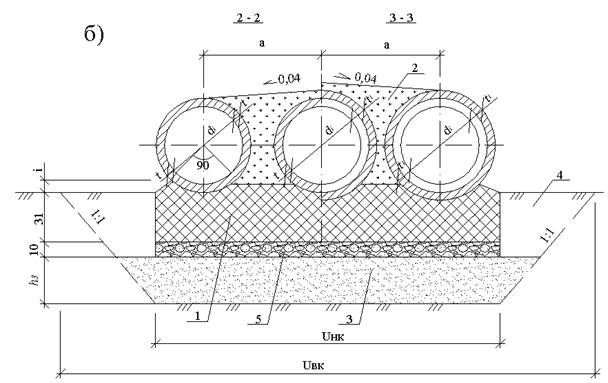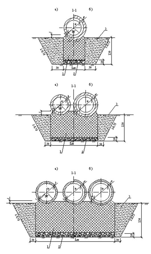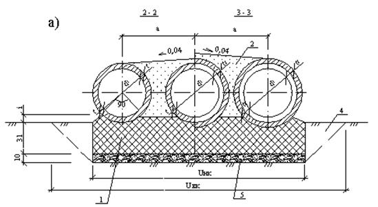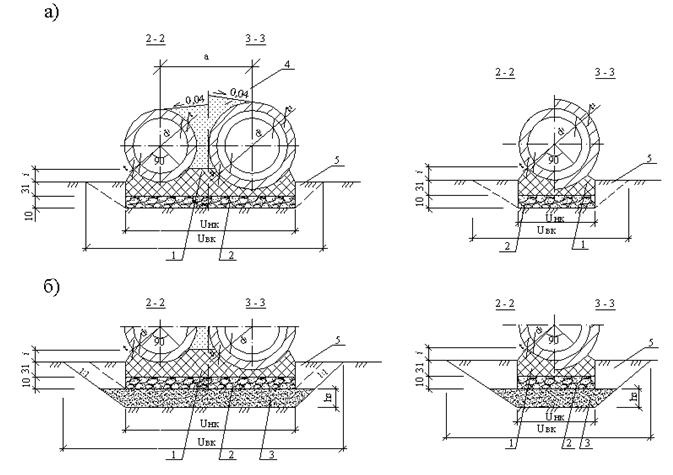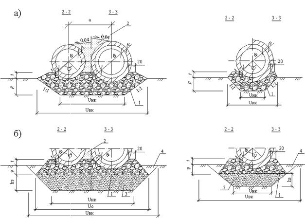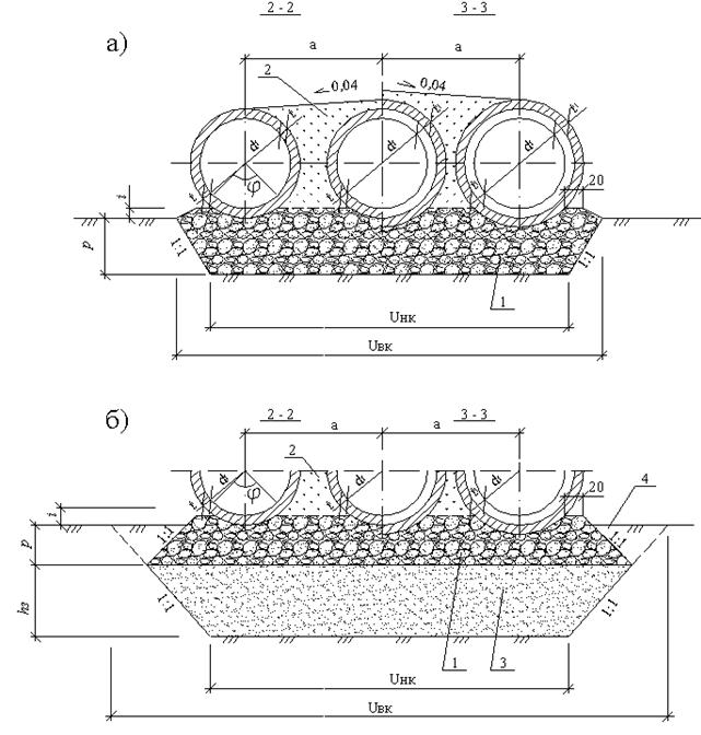 Рисунок 2.6.5 Поперечные разрезы 2 – 2 и 3 – 3 (см. рис.2.6.1) трехочковых труб на подушке из гравийно-щебеночной смеси: без замены грунта (а) или с заменой (б): 1 – ПГС (щебень); 2 – засыпка пазух ПГС; 3 – замена грунта основания; 4 – обратная засыпка котлована