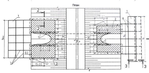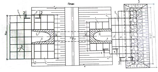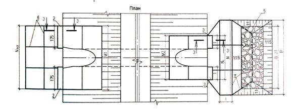 Рисунок 2.6.9 Схема плана трубы при укреплении откосов нетканым синтетическим материалом русла плитами ПК 100.12.е: 1- плиты ПК100.12.е; 2 – НГ СТ; 3 - строительный раствор; 4 – скобы; 5 – колья