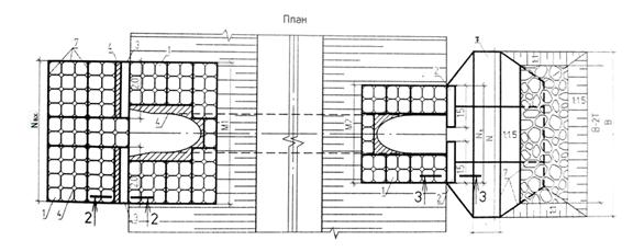 План включает (рис.2.6.8-2.6.10) изображение начала и конца трубы, очертание границ укрепления русла на выходе, на входе, откосов в соответствии с принятым типом укрепления, его размерами (см. § 2.5).