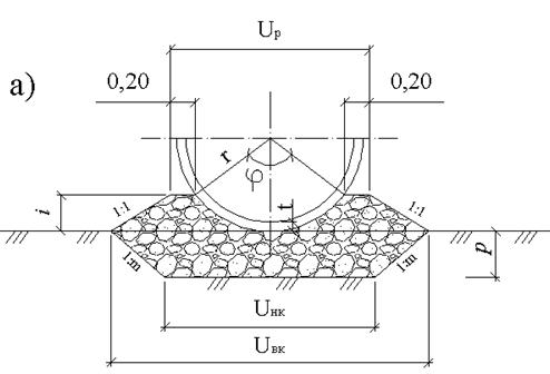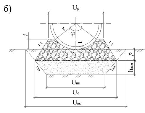 Рисунок 2.7.1 Поперечное сечение основания бесфундаментной одноочковой трубы без замены грунта под основание (а) и с заменой грунта (б)