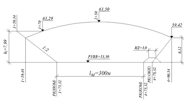 Предположим, что пересечение проектной линии и откоса конуса подхода РК(П) находится на пикете 1+60. Вычислим Н1+60=61,23 м, h1+60=61,23-53,30=7,93 м; РК(НМ)=(1+75,32) - 2·7,93=1+59,46 м.