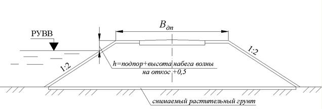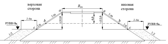 Рисунок 3.4.4 Поперечное сечение насыпей подходов с верховой стороны (левый откос) и с низовой стороны (правый откос): РУВВ – расчетный уровень высокой воды