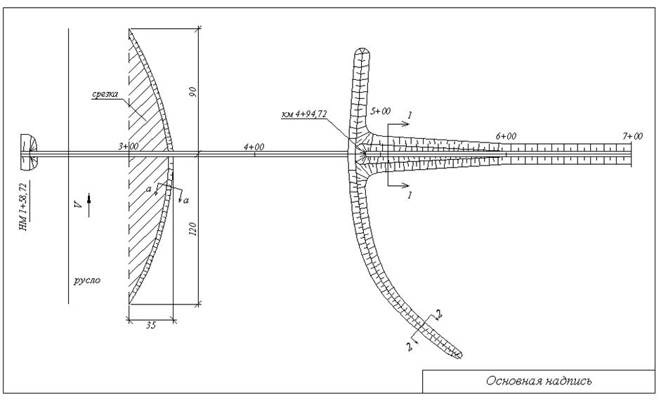 Очертание струенаправляющей дамбы наносится по данным расчета, выполненного в § 3.3. Показывается пикетное положение корня дамбы. У подошвы речного откоса показывается рисберма (упор укрепления откоса монолитным бетоном и сборными плитами).