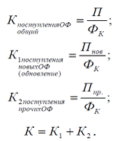 Коэффициент поступления исчисляется путем деления стоимости всех поступивших в течение года основных фондов на стоимость основных фондов на конец года. Этот общий коэффициент поступления также можно разложить на ряд частных коэффициентов: