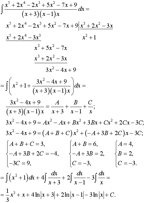 4. Интегрируем целую часть (если она есть) и элементарные дроби, используя табличные интегралы, и записываем ответ