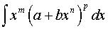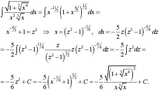 План решения. Выражение называется дифференциальным биномом. Условия его интегрируемости в элементарных функциях получены П.Л. Чебышевым. Интеграл