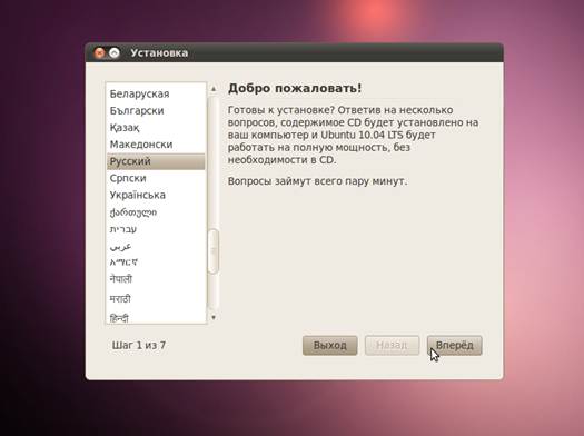 - Шаг 1 в графическом мастере установки подразумевает выбор языка для новой операционной системы. Выбрав язык на левой панели, нажмите кнопку «Вперед».