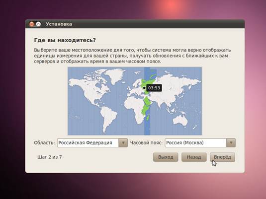 - Выберите часовой пояс. Можно либо просто щёлкнуть в нужном месте на карте, либо выбрать регион или крупный город, находящийся в вашем часовом поясе. Установив часовой пояс, нажмите кнопку Вперед.