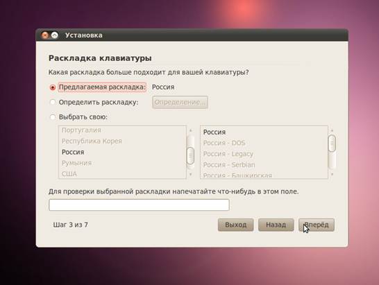 - Третий шаг связан с настройкой клавиатуры. Можно оставить опцию Предлагаемая раскладка или выбрать собственные настройки, указав язык клавиатуры на левой панели и раскладку клавиатуры на правой панели. Определившись с выбором, нажмите кнопку Вперед.