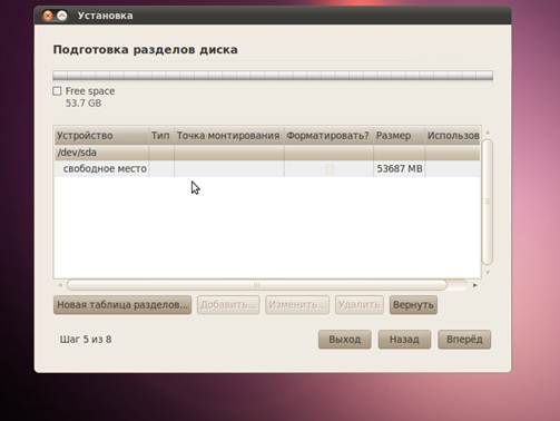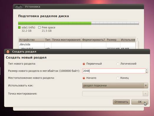 - Выберите пункт свободное пространство и нажмите кнопку Добавить…. Заполните все поля, кроме «Точка монтирования» и нажмите OK. (В поле размер нового раздела введите число, равное объему оперативной памяти).
