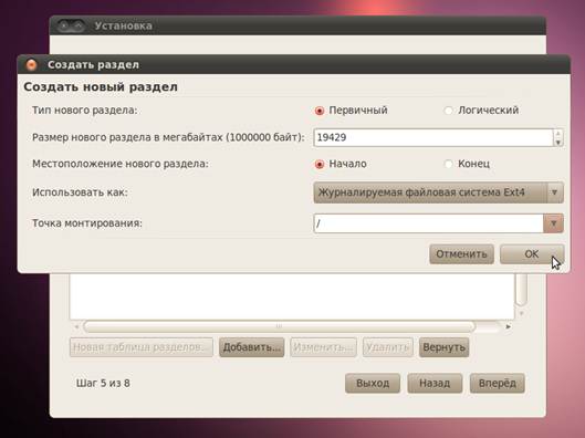 - Далее нужно создать корневой раздел (/). Выберите пункт свободное пространство и нажмите кнопку Добавить…. Поскольку корневой раздел будет содержать все точки монтирования, вы должны выделить для него место. Минимум для корневого раздела (/) - 4 Гбайт. Рекомендуется выделить под корневой раздел от 15 Гбайт и более, в зависимости от того, сколько у вас доступно места. Для данного раздела выберите Журналируемая файловая система Ext4, точку монтирования - /, затем нажмите OK.