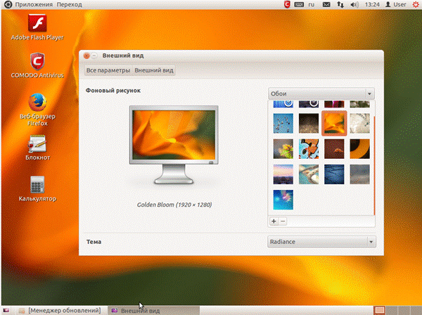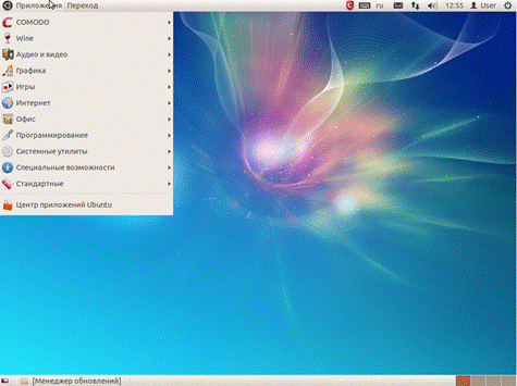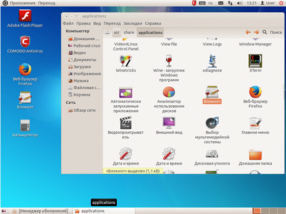 - Осмотреть верхнюю и нижнюю панели. При нажатии на кнопку «Приложения» можно увидеть список основных программ, установленных на компьютере.