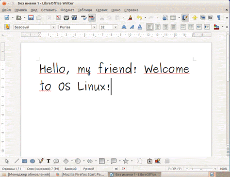 - Щелкнуть мышью на «Текстовый документ». Откроется программа LibreOffice Writer, функционал которой очень похож на всем знакомый Word из пакета Microsoft Office для Windows. Введите в редактор текст и примените к нему настройки шрифта.
