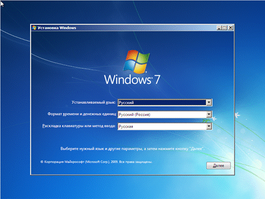 · После загрузки высветится начальное окно установки ОС Windows 7: