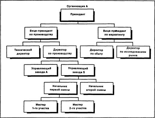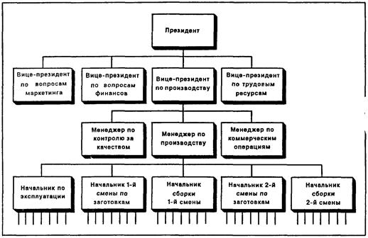 ОБЪЕМ УПРАВЛЕНИЯ. Вертикальное разделение труда, т.е. отделение работы по координации от непосредственного выполнения заданий, необходимо для успешной групповой работы. Преднамеренное вертикальное разделение труда в организации дает в результате иерархию управленческих уровней, описанную в гл. 1. Центральной характеристикой этой иерархии является формальная подчиненность лиц на каждом уровне. Лицо, находящееся на высшей ступени управления, может иметь в своем подчинении нескольких руководителей среднего звена, представляющих различные функциональные области. Эти руководители среднего звена могут в свою очередь иметь несколько подчиненных из числа линейных руководителей. Например, руководитель производства может иметь в своем подчинении до 10 начальников, включая руководителей смен и различных функциональных зон. Иерархия пронизывает всю организацию, спускаясь на уровень неуправленческого персонала. Рис. 3.3. представляет пример вертикальной иерархии.