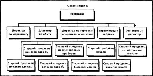 В организации А на рис. 3.4.13 руководителей, каждый из которых имеет сферу контроля, равную 2. В результате в организации имеются 6 уровней управления. В организации Б, где сфера контроля равна б, существует только 3 уровня, несмотря на большее общее количество руководителей. Заметим, что конкретные числа были выбраны для иллюстрации концепции. На практике сфера контроля в организации часто варьируется в значительной степени как по уровням управления, так и по функциональным областям.