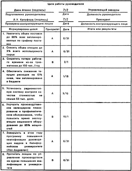Рис. 10.4. Цели работы руководителя. Представлена простая формулировка рабочих заданий для руководителя, участвующего в программе МВО. После определенного периода времени фактические результаты будут занесены в соответствующую колонку, что облегчит сравнение действительных показателей работы руководителя с запланированными результатами.