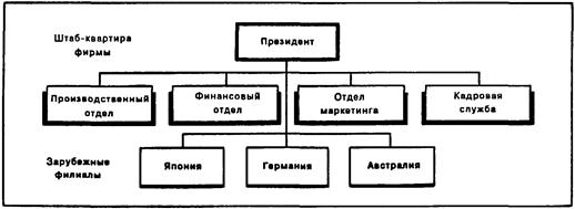 Компании, которые значительно увеличили объем продаж на зарубежных рынках, начнут изучать возможность создания в соответствующих странах своих производственных мощностей. Однако доля зарубежных продаж в общем объеме реализуемой продукции может оставаться относительно небольшой. Как следует из рис. 12.5., руководитель каждого зарубежного производственного филиала подчиняется исполнительному директору или президенту всей фирмы. При этом центральное руководство фирмы обычно оказывает помощь своим зарубежным филиалам в вопросах производства, маркетинга, финансовых и людских ресурсов. Определенная часть штабного персонала главного управления фирмы переводится в зарубежные филиалы для того, чтобы обеспечить эффективную реализацию стратегических планов и задач фирмы в целом.