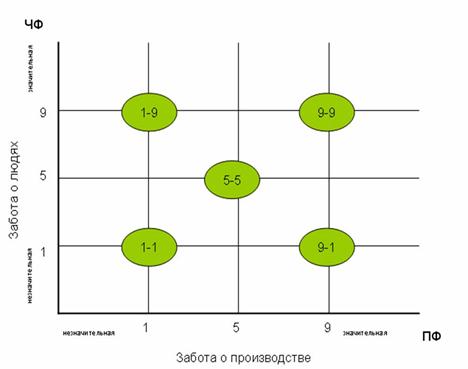 1-9 - руководитель с либеральным стилем руководства, учитывающий человеческий фактор, однако явно недостаточное внимание уделяющий производству (создает "дом отдыха" на работе). Его девиз - "Делай, как хочешь".