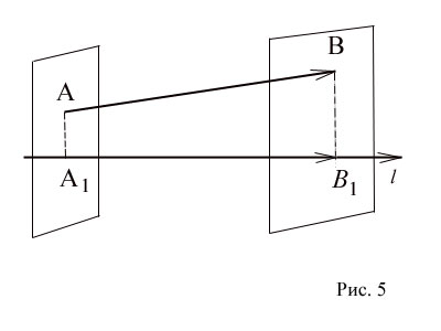 - проекции его начала (точки A) и конца (точки B) на ось l. (Для построения проекции точки A) на прямую проводим через точку A плоскость, перпендикулярную прямой. Пересечение прямой и плоскости определит искомую проекцию.