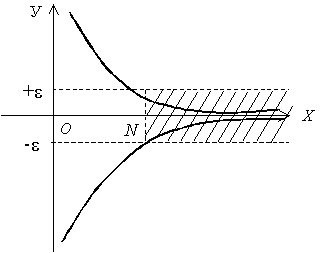 Рис. 68 | Геометрически: Функция y = f (x) будет бесконечно большой величиной при , если функция может принимать значения по абсолютной величине больше наперед заданного числа N (рис. 68): (4.15) |