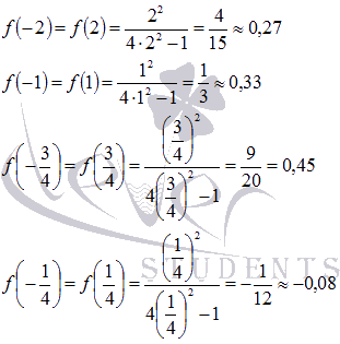 Для нашего примера найдем значения функции в точках х=-2, х=-1, х=-3/4, х=-1/4. В силу четности функции, эти значения будут совпадать со значениями в точках х=2, х=1, х=3/4, х=1/4.