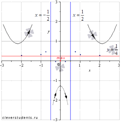 Схематично плюсами / минусами отмечены промежутки где производная положительна / отрицательна. Возрастающие / убывающие стрелочки показывают направление возрастания / убывания.
