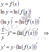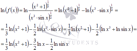 представляет собой дробь и ее производную можно искать с использованием правил дифференцирования. Но в силу громоздкости выражения это потребует множества преобразований. В таких случаях разумнее использовать формулу логарифмической производной