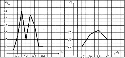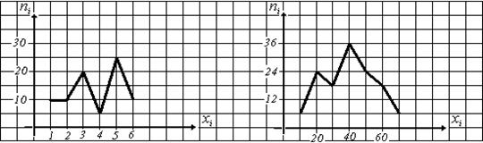 Найти объем, размах, среднее выборочное, моду и медиану выборок, представленных полигонами частот.