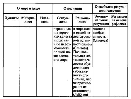 В начале Нового времени, несмотря на усилия Ф. Бэкона, более распространенным был рационалистический подход, который разрабатывался такими известными учеными, как Р. Декарт, Б. Спиноза, Г.В.Лейбниц (см. табл. 3). Во многом это было связано с необходимостью для психологии и философии преодолеть последствия схоластики. Однако уже к середине века бурное развитие точных наук, промышленности сделало очевидной необходимость учитывать в психологии и новые требования, а потому все большее распространение стал получать сенсуализм, представленный в это время в концепциях Д. Локка и Т. Гоббса.