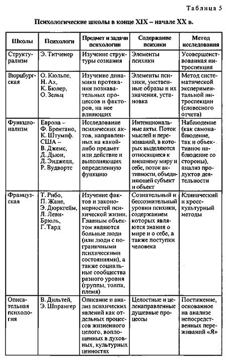 Рубеж веков ознаменовался для психологии первым разделением прежде единой психологии на ряд школ. Однако в тот момент это еще было связано с отказом от единого подхода к пониманию предмета психологической науки и методов исследования психики. Речь шла, скорее, о разных аспектах в изучении психики, отождествляемой главным образом с сознанием. При этом в центре внимания психологов оставались преимущественно познавательные процессы, хотя разные школы отличались друг от друга пониманием места данных процессов в общей картине психической жизни. Главные же разногласия были связаны с определением содержания сознания и границ его экспериментального изучения (см. табл. 5).