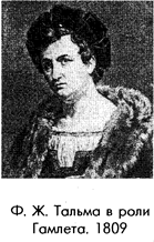 Самой значительной фигурой во французском театре конца XVIII — начала XIX вв. был Ф.Ж. Тальма (1763—1826) — величайший актер революционного классицизма. Его гуманистическая устремленность помогла ему преодолеть ограниченность помпезного, официального искусства в послереволюционный период. Выступал в трагедиях Шекспира, создал образы мятущихся, раздираемых внутренними противоречиями людей, тонущих в мире зла и корысти. Он реформировал актерскую классицистическую технику, утвердил подлинный античный костюм и дал мощный толчок развитию французского театра по пути романтизма.