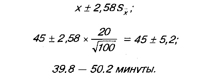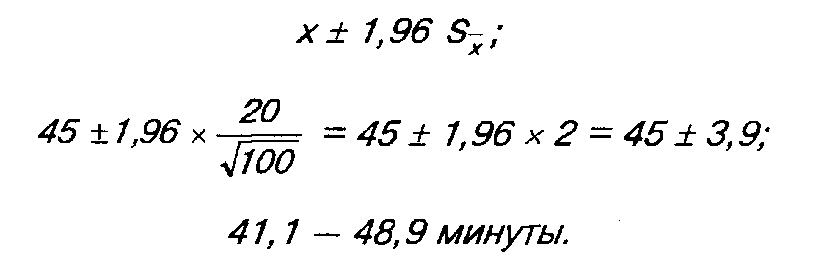 Например, для членов выборки (100 читателей какой-то газеты) было установлено, что среднее время чтения газеты составляет 45 минут при средней квадратической ошибке в 20 минут. При уровне доверительности, равном 95%-ном, получим