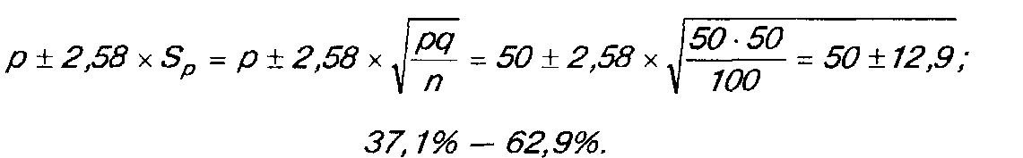 Если используются проценты и оказалось, что из выборки в 100 человек 50% опрошенных по утрам пьет кофе, то при уровне доверительности в 99% получим следующий диапазон оценок: