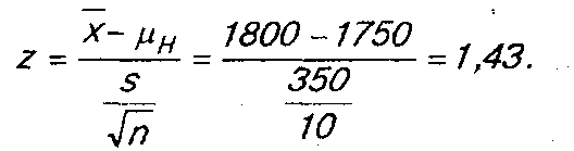 Выборка составила 100 человек, средняя для выборки равнялась 1800 долларам и среднее квадратическое отклонение составляло 350 долларов. Возникает вопрос, является ли большой разница (50 долларов) между гипотетической зарплатой и ее средним значением для выборки. Проводим расчеты по формуле (4.2):