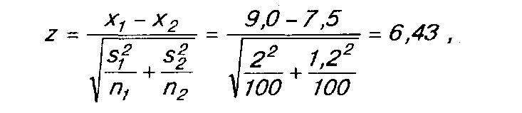 Рассмотрим следующий пример. Попытаемся ответить на вопрос: «Есть ли разница в потреблении прохладительных напитков между девушками и юношами?». При опросе был задан вопрос относительно числа банок прохладительных напитков, потребляемых в течение недели. Описательная статистика показала, что в среднем юноши потребляют 9, а девушки 7,5 банок прохладительных напитков. Средние квадратические отклонения, соответственно, составили 2 и 1,2. Объем выборок в обоих случаях составлял 100 человек. Проверка статистически значимой разницы в оценках осуществлялась следующим образом: