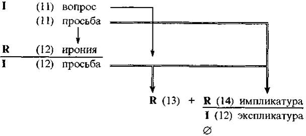 Для того, чтобы наиболее полно выразить функциональное своеобразие хода (12) в структуре обмена (11—14), можно обозначить его как реактивно - инициативный и схематично записать RI, [ср.: R/I; response/initiation — Stubbs 1983: 131]. Реактивная импликатура — косвенный ответ на (11) и в меньшей степени (12) сосуществует с инициативной экспликатурой и в (14). Поэкспериментировав с диалогом, посмотрим, что происходит, если вдруг «убрать» ход (13), эксплицирующий предварительные условия или прагматическую пресуппозицию просьбы: единственного хода (14) оказывается вполне достаточно для нормального завершения всего обмена, что отводит акту (13) роль вспомогательного хода в сложном (13—14). Этим же следует оправдать включение (14) в данный обмен, хотя с учетом следующего за ним молчания («знака согласия») можно говорить о четвертом обмене в первой трансакции. Конец трансакции выделен экстралингвистически (действиями D).