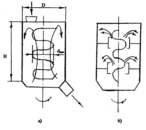 Конструкции таких смесителей бывают с открытым шнеком (а) и со шнеком, частично закрытым кожухом (б). Смесители с открытыми шнеками применяются для смешивания соломы. С закрытыми – для смешивания концентрированных кормов.