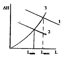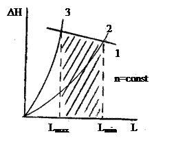 | 1. характеристика вентилятора; 2. характеристика сети при полностью открытом воздуховоде; 3. характеристика сети с задросселированным воздуховодом. | 1. характеристика вентилятора при n = max; 2. характеристика вентилятора при n = min. 3. характеристика сети. |