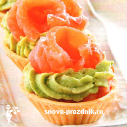 2 спелых авокадо измельчить в блендере, полить столовой ложкой лимонного сока, приправить солью и перцем. На дно готовых тарталеток положить немного творожного сыра, ломтик помидора, пасту из авокадо, кусочек семги.