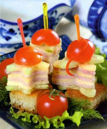 Сложить на доску запеченный хлеб, затем слоями огурец, ветчину и сыр. Сверху положить половинку помидора. Все это нанизать на шпажку.