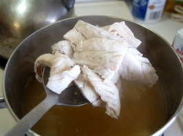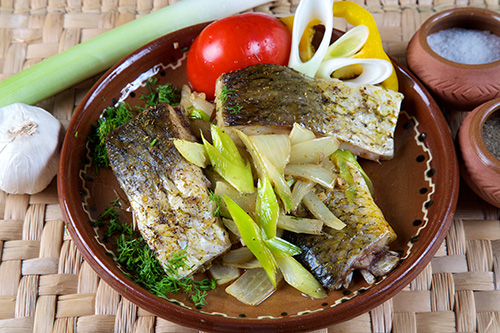 Целую рыбу, большие ее куски и звенья перевязывают и привязывают к решетке рыбного котла в двух — трех местах. Целые рыбы укладывают на решетку брюшком вниз, а большие куски и звенья — кожей вниз. Решетку с рыбой вставляют в котел и наливают холодную воду так, чтобы она была выше уровня рыбы на 2—4 см, затем добавляют соль, перец горошком, лавровый лист, морковь, петрушку и репчатый лук, доводят до кипения, после чего нагрев ослабляют и дальнейшую варку ведут без кипения при 85—95°С. Готовность рыбы определяют путем прокалывания ее поварской иглой.