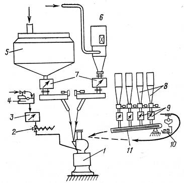 1 — резиносмеситель; 2 — электромагнитный клапан для продувки линии сжатым воздухом; 3 — автоматические весы для мягчителей; 4 — напорный бачок для мягчителей; 5 — бункер для наполнителя; 6 — бункер для резиновой муки; 7 и 9 — автоматические весы для наполнителя резиновой муки и ускорителей вулканизации; 8 — бункера для мелких навесок; 10 — подвесная люлька цепного конвейера для подачи каучуков и паст; 11 — ленточный конвейер
