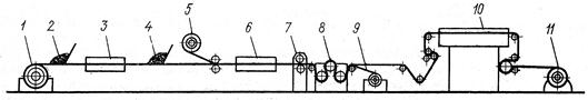Линия по производству пленки переносным методом работает следующим образом. Транспортная подложка с размоткой устройства 1 поступает на ножевую раклю 2 для формирования монолитного слоя. Затем полуфабрикат поступает в камеру 3,где происходит поджелирование монолитного слоя. После незначительного охлаждения 4 полуфабрикат поступает на ножевую раклю 5 для нанесения пористого слоя, затем в КЖВ – 6, где происходит окончательное желирование и вспенивание продукции. Далее поступает на ти снительный каландр 7 и на охлаждение 8. После охлаждения при помощи специального устройства происходит отделение готовой пленки от транспортера подложки. Готовая пленка наматывается на рулон, а транспортерная подложка после очистки и дополнительной обработки стеариновой кислотой снова подается на размоточное устройство 1. В приведенной схеме может отсутствовать каландр 7. В этом случае рисунок теснения на монолитную сторону может переноситься с транспортера – подложки. Скорость работы этой линии 4-15 м/мин. Камера желирования-вспенивания в 2 раза длиннее камеры желирования.