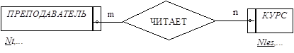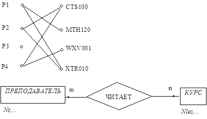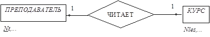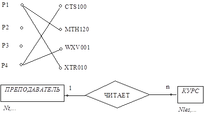 Например, пусть проектируется БД, предназначенная для хранения информации о преподавателях университетского факультета и о тех курсах, которые ими читаются. Двумя главными объектами или сущностями, представляющими в данном случае интерес, являются ПРЕПОДАВАТЕЛЬ и КУРС. Эти две сущности соотносятся между собой с помощью связи ЧИТАЕТ, что позволяет нам сказать: «ПРЕПОДАВАТЕЛЬ ЧИТАЕТ КУРС».