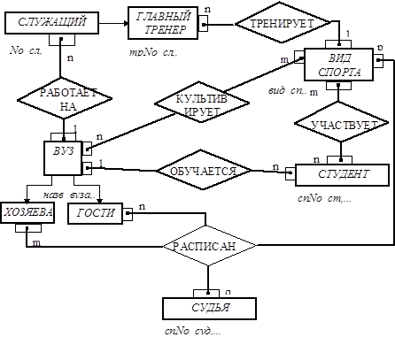 Построение ER-диаграммы. Для рассматриваемой проблемы было решено, что представляющими интерес основными сущностями являются: ВУЗ, ВИД СПОРТА, СТУДЕНТ, СУДЬЯ и СЛУЖАЩИЙ. Анализ имеющихся между этими сущностями связей позволяет построить диаграмму ER-типа, изображенную на рис. 2.14. Здесь у служащих была выделена отдельная роль ГЛАВНЫЙ ТРЕНЕР, а у вузов - роли ХОЗЯЕВА и ГОСТИ.